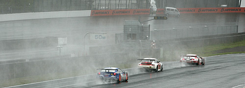 15分ほどの中断ののち、走行は残り6分で再開。このころになると雨はほとんど止み、路面コンディションもかなり良くなってくる。ここでNo.12 カルソニックIMPUL Zの井出有治が1分59秒567、No.1 ザナヴィニスモZのライアンが59秒296と2台のZが2分を切ってくる。No.12はさらに59秒315までタイムを縮めるが、No.1は58秒857と唯一の58秒台に入れこのセッションのトップを最後に奪った。また、ポールのNo.35 イエローハットYMSスープラも最後のラップで2分を切って3番手に入り、ウエット状態でも好パフォーマンスを見せた。