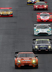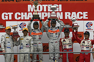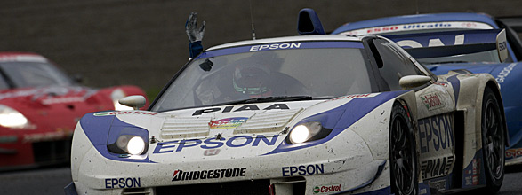 新田守男「連勝は期待はしてましたが、こんなにうまくいくとは思いませんでした。正直、こんなコンディションでしたが、タイヤ選択や作戦がいい方向に行ったんで、皆さんに感謝しています。今年は1勝で終わりかなと思ってましたから。でも通算11勝目ということは、それだけ皆さんにボクを使っていただいたということですから、だからすべてのスタッフの方に感謝しています。コースアウトは、ペースを落としていたつもりなんですけど、チョイスしたタイヤがかなりハードで、8分のフリー走行とスタートしてからの感触がすごくて違ってしまって、ボクがミスした形になりました。ただ、そのあとのペースはボクたちが思っていたペースにほぼなったので、あの段階であわてることはありませんでした。今回は、ボクが経験した中ではサファリラリー以来の悪コンディションでした(笑)。普通に走っていても前が見ないくらい、ものすごく泥がウインドウに付いて、それで見えなくてコースも泥の色でコースなんだか泥なんだかわかんない状況でした。だからGT500が通って行ったときに出た水しぶきでワイパー使って、そう洗車状態(笑)にしないと回りが分からないくらい視界が悪かったです。オイルも出てたし。そういう状況で勝てたということは、良かったかのと思います」