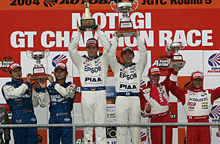 2004年AUTOBACS全日本GT選手権(JGTC)第5戦「もてぎGTチャンピオンレース」の決勝レースが、9月5日に栃木県・ツインリンクもてぎで開催された。時折小雨の落ちる微妙な天候の中、No.32 EPSON NSXが快走し、優勝した。GT300クラスはNo.43 ARTA Garaiyaが前戦に続いて連勝を果たした。