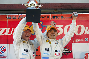 11月21日、2004 AUTOBACS全日本GT選手権第7戦「SUZUKA GT 300km」の決勝レースが、三重県・鈴鹿サーキットで開催された。多くのファンが詰めかけたスタンドを前に、両クラス共にハードなバトルを展開。No.12 カルソニックIMUPL Zが今季初優勝。ドラバーズタイトルは、7位に入ったNo.1 ザナヴィニスモZの本山哲/R.ライアン組が手にした。GT300クラスはチャンピオンを争うNo.43 ARTA GaraiyaとNo.16 M-TEC NSXがトップ・バトルを繰り広げる大激戦。この結果、M-TEC NSXが初勝利し、山野哲也/八木宏之組がチャンピオンをも獲得した。