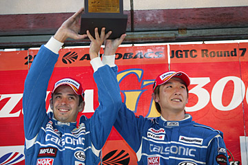 八木宏之「僕らのタイヤはウォーム(温まり)が良くて、出て1周目のタイムが良かったんで、クルマもそれに合わして仕上げました。走り始めは良かったです。テストや週末で得たデータ通りの走りができました。ガライヤの状況は、毎周無線で聞いてました。今回は1周の時間が経つのがすごく長く感じました。でも、絶対負けないと思って走りました。これまでの6戦は自分のミスで落としたこともあったんで、そうならないようにとがんばりました。今年始めてJGTCに出て、最初にチェッカーを受けるなんて初めてだったんで、表彰台では全然実感がありませんでした。(今日は)それより、無線の罵声……、いや応援(笑)ですね、それが印象深いことですね」
