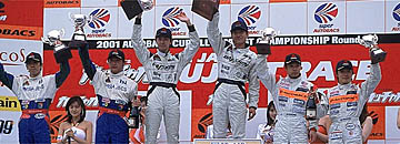 脇阪寿一「スタートはムリな加速はしたくなかった。1コーナーで混乱にならないように、自分のポジションが下がってもいいと思っていた。3番手に落ちたけど、立川くん(No.38)がプッシュしているのはわかっていたし、タイヤのことはよくわかっていたんで、ムリせずにいきました。それに、ピットでひっくり返せると確信してたから。そのあとも野田さんがいい走りをしてくれて、20秒近くも離してくれましたから、あとはクルージングです。考えていたことは、クラッシュしたクルマの破片を拾わないかとか、雨の心配だけでした。とにかくメチャうれしいですよ。フォーミュラでも速いところは見せられても勝てないし、TIも…。クルマはいいものを与えてもらっているのに、これで勝てなきゃ(ドライバー)辞めますよ。って辞めないだろうけど(笑)」