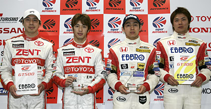 若干のインターバルを空けてGT300クラスのスーパーラップがスタート。No.2 プリヴェチューリッヒRD320R(高橋一穂)、No.52 プロμ太陽石油KUMHOセリカ(平中克幸)の2台からコースインしていく。2組目のNo.62 WILLCOM ADVAN 350R(柴原眞介)とNo.30 RECKLESS MR-S(佐々木孝太)はいずれも前の組を上回り、1分41秒台に入れてくる。3組目、No.43 ARTA Garaiya(新田守男)とNo.31 APEXERA MR-S(中嶋一貴)ではNo.43が速く、1分41秒339でここまでのトップに。さらにこれを上回ったのが4組目に出走したNo.46 Dream Cube's ADVAN Zの星野一樹。1分40秒856と、ついに1分40秒台に入れ、トップを奪った。しかし、前日から好タイム連発のNo.0 EBBRO M-TEC NSX(黒澤治樹)は一枚うわ手だった。クラス最後に、No.27 direxiv ADVAN 320R(密山祥吾)とともに出走、1分40秒682をマーク。みごとクラスポールを奪ってみせた。黒澤はGT初ポール。2番手はNo.46 Dream Cube's ADVAN Z、3番手はNo.27 direxiv ADVAN 320Rだった。