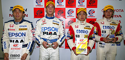 9月24日午後、富士スピードウェイで2005 AUTOBACS SUPER GT第6戦「FUJI GT 300km RACE」の予選2回目が行われ、GT500はNo.32 EPSON NSXのA.ロッテラー、GT300はNo.0 EBBRO M-TEC NSXの細川慎弥と、両クラスともNSXがポールポジションを獲得した。(観衆:20,800人) QUALIFY SESSION 2 雨、気温24度、路面温度25度、ウェット 予選2回目は14時35分から始まった。最初の15分間はGT300クラスの専有、つづく15分間がGT500クラスの専有走行。始まった時点では雨は降っていなかったが、GT300の走行中から雨粒が落ち始め、GT500の走行が始まるころには本格的な降りに。その後のスーパーラップではウェット用のタイヤでなければ走れない状況となった。 つづいてGT500クラスのスーパーラップが開始される。このころにはほぼ雨は上がっていたが、1台ずつ走るため、走行ライン上の水がはけるまでには至らず、路面コンディションはやはり完全なウェット。路面温度も低く、タイヤのグリップレベルが上がらないままむずかしいアタックを行わなければならない。 POLE POSITION INTERVIEW