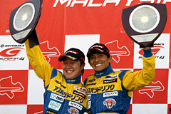 - 今年は、第1戦鈴鹿で2位といいスタートを切れたんですけど、その後の2戦をクラッシュ、アクシデントとノーポイントが続いてしまった。ここセパンで必ず勝ちたいと、チームもドライバーも考えていました。そういう意味では目標とおりでした。RX7はセパンで強いと言われていますが、でも言われているとおりにいかないのがGTというレースなんです。そんな中で結果に結びつけることができて、良かったと思います。レースでは、走り出して3分の1くらいでクールスーツが壊れてしまい、最後の方は視界が狭くなるくらいツラい状態でした。でも、ここでなんとかして勝ちたいという気持ちがあったんで、走りきることができたんだと思います。2位を走っていた密山選手(No.27)もクールスーツにトラブルがあったみたいでペースが上がらなかったので、これは僕らにすれば助かったと思います。危ないところもあったんですがなんとか勝てて、チャンピオンシップも楽しみになったかなと思います