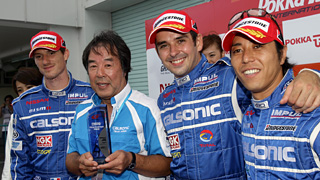 - この席(ポール記者会見)は立川(祐路)と組んでたとき(GT500のセルモスープラ)に何度も来ていますが、自力で来たのは……、全然記憶にないです(苦笑)。97年とか、そのくらいにスープラで富士で獲った憶えがあるんですけどね(実際は99年第2戦の富士)。自分でチームを作って、昨年からクムホタイヤとタイヤ開発も行って、やっとここまで来れた。そう思うと、非常にうれしいですね。今日はもう少し暑くなるのかと思って、それにも対応できるタイヤを選んだんです。7月末のもてぎテストから調子がとても良かったから、ここで一発ねらおうかとチームとも話していました。それが実現できて、本当にうれしく思います。ボクもこの1000kmで優勝したこともあるんですが、今年はSUPER GTになったということで、今までとはひと味違うと思います。(心配は)いろいろあると思いますが、一番はボクの体力です(笑)。セリカはホント暑いし、ボクも(年齢的に)体力が低下してるから、ウチの若い2人にがんばってもらわないと、明日の勝ちはないですね